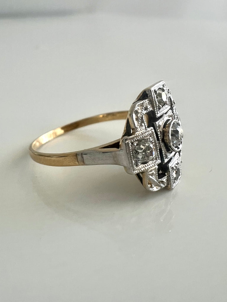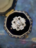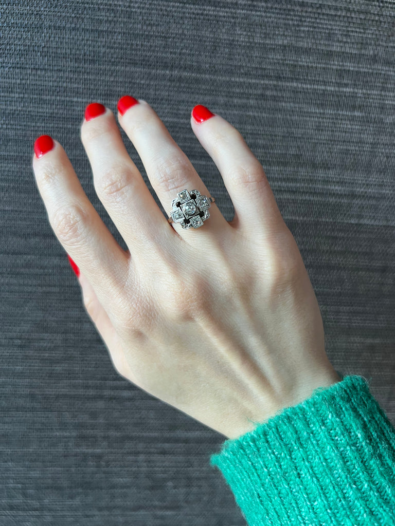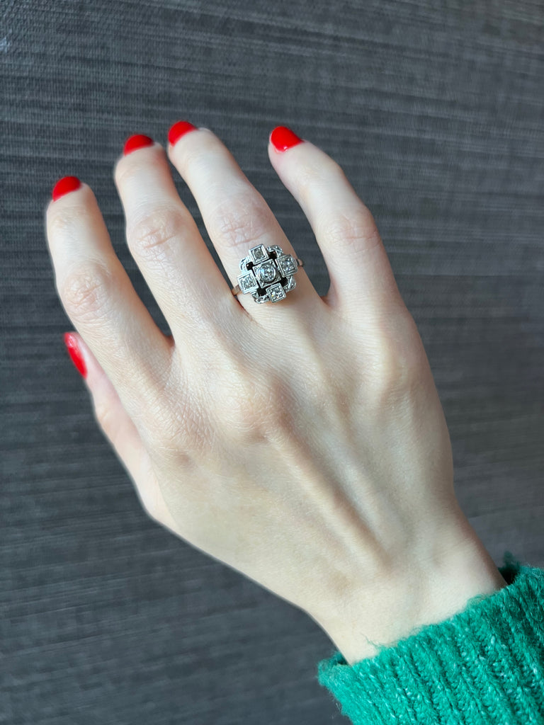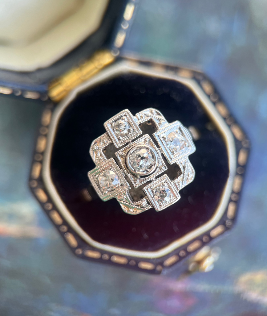 A striking example of Art Deco geometry, this finely crafted antique ring showcases a balanced square design set with natural old-European cut diamonds.
