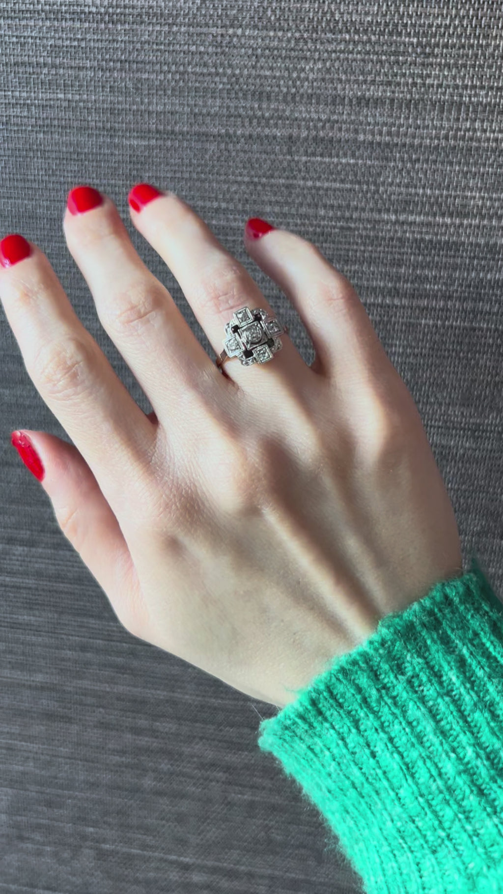 The composition reflects the architectural precision of the Art Deco period, where symmetry and refined metalwork take center stage. The diamonds display lively scintillation under changing light, while the structured square head gives the piece strong presence on the hand despite its elegant weight.
