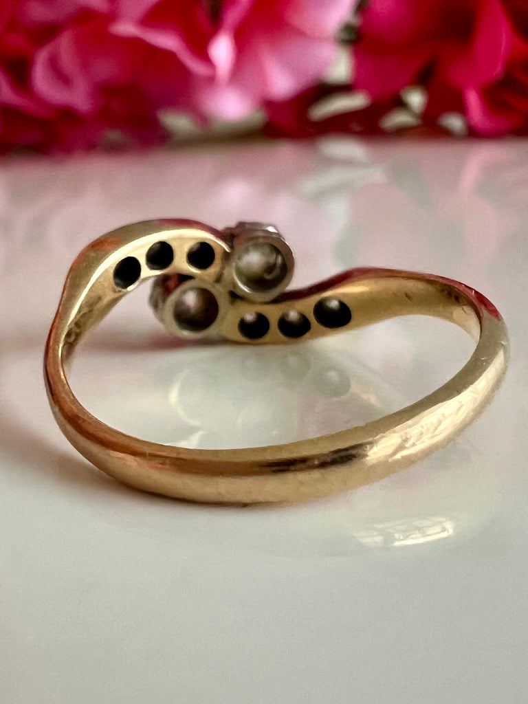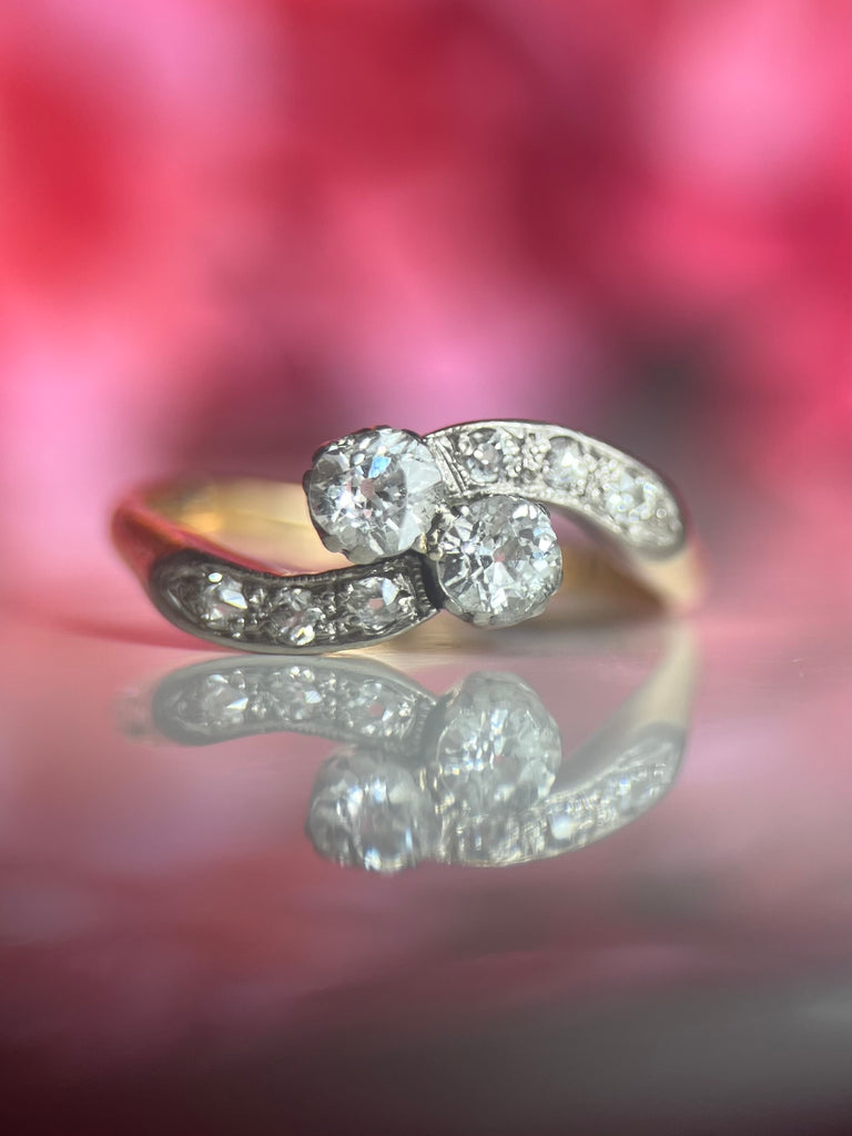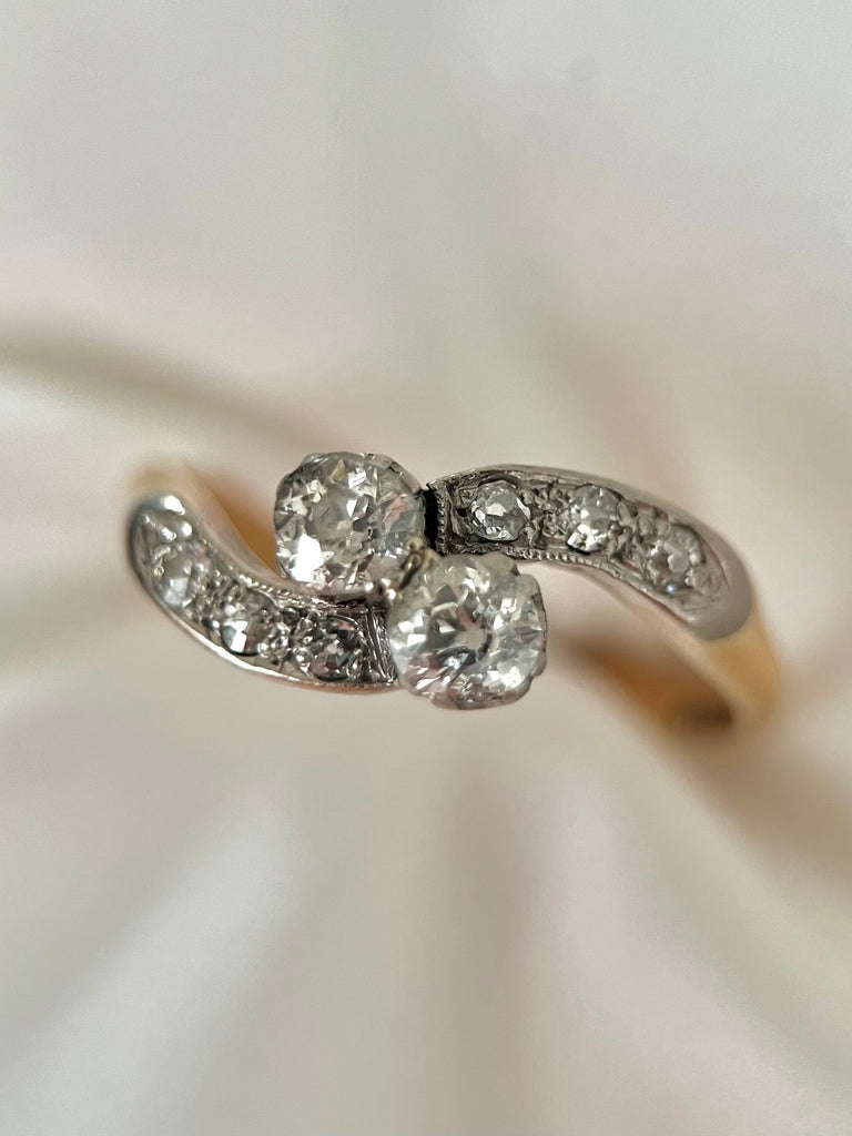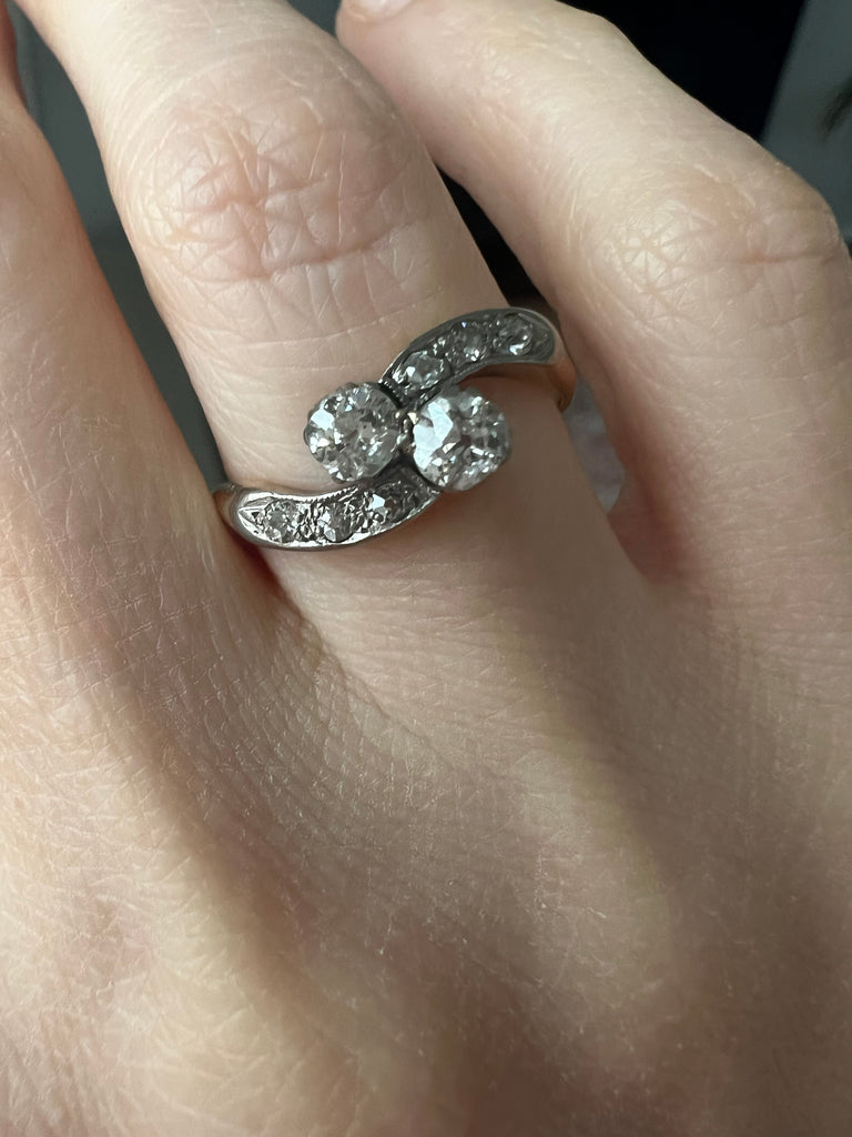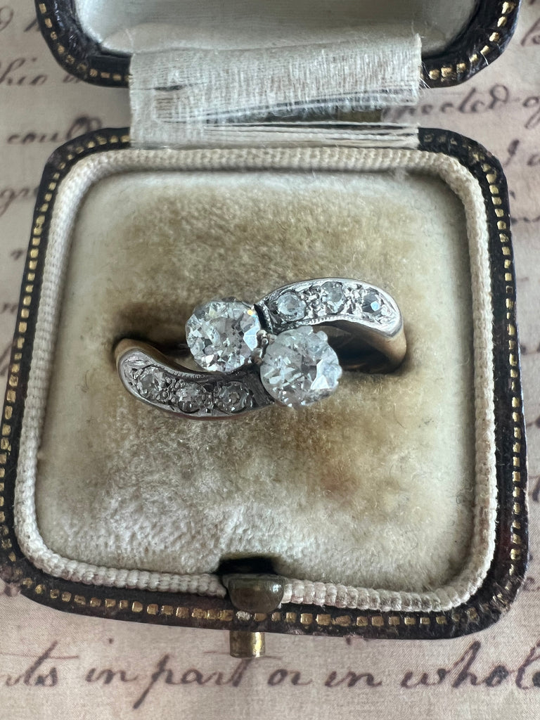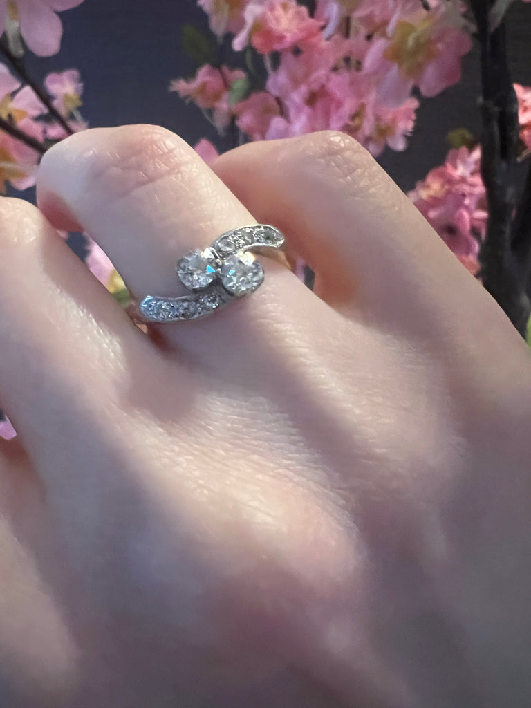 I’m thrilled to offer this romantic toi et moi ring. Two diamonds curve toward one another on a graceful bypass, a classic symbol of two souls meeting.