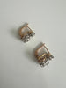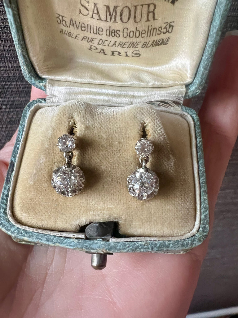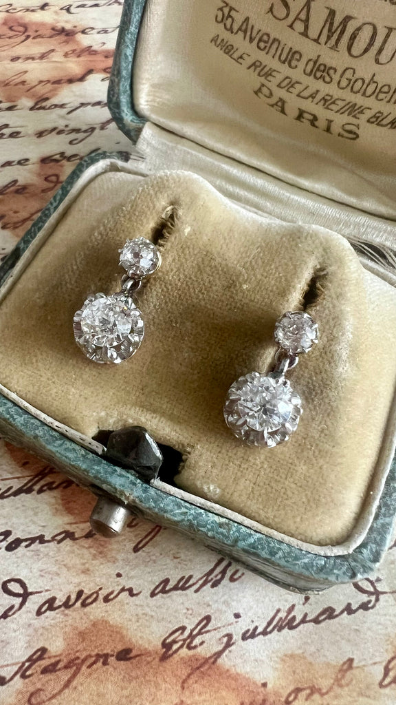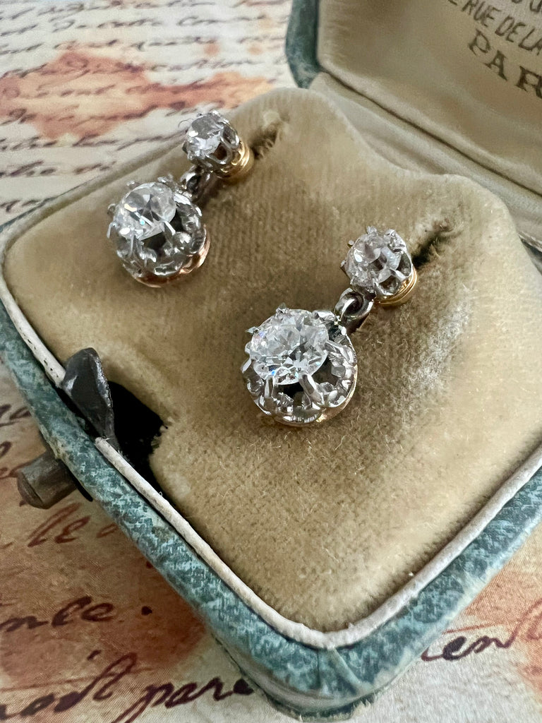 These antique drop earrings feature a refined pair of old mine cut diamonds, suspended beneath matching old mine cut tops in a classic dormeuse design. Crafted in 18k rose and yellow gold with platinum settings, the platinum crowns enhance the diamonds’ brightness while the gold adds warmth and contrast a characteristic combination of early 20th-century jewelry.