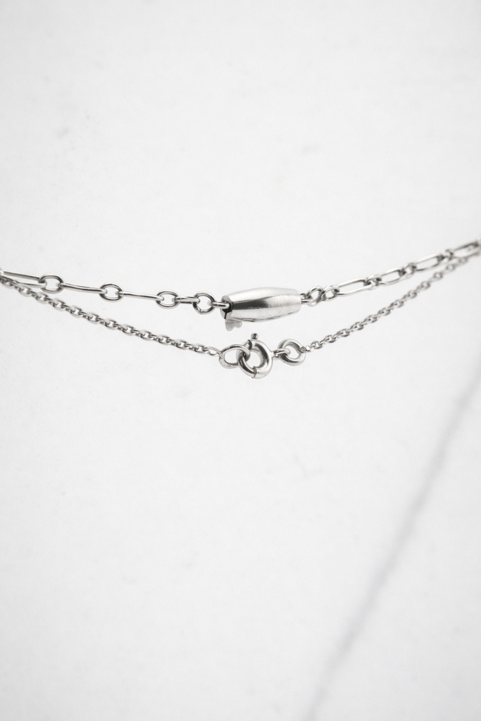 Crafted in the classic Edwardian combination of gold with platinum-topped settings and an 18K white gold chain, this piece balances strength and fineness beautifully. The knife-edge bar, millegrain details, and airy openwork are all textbook period construction.