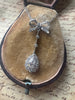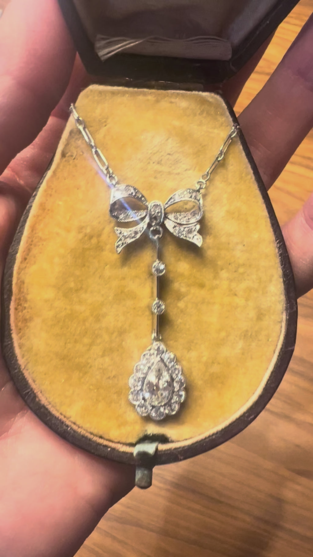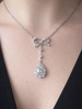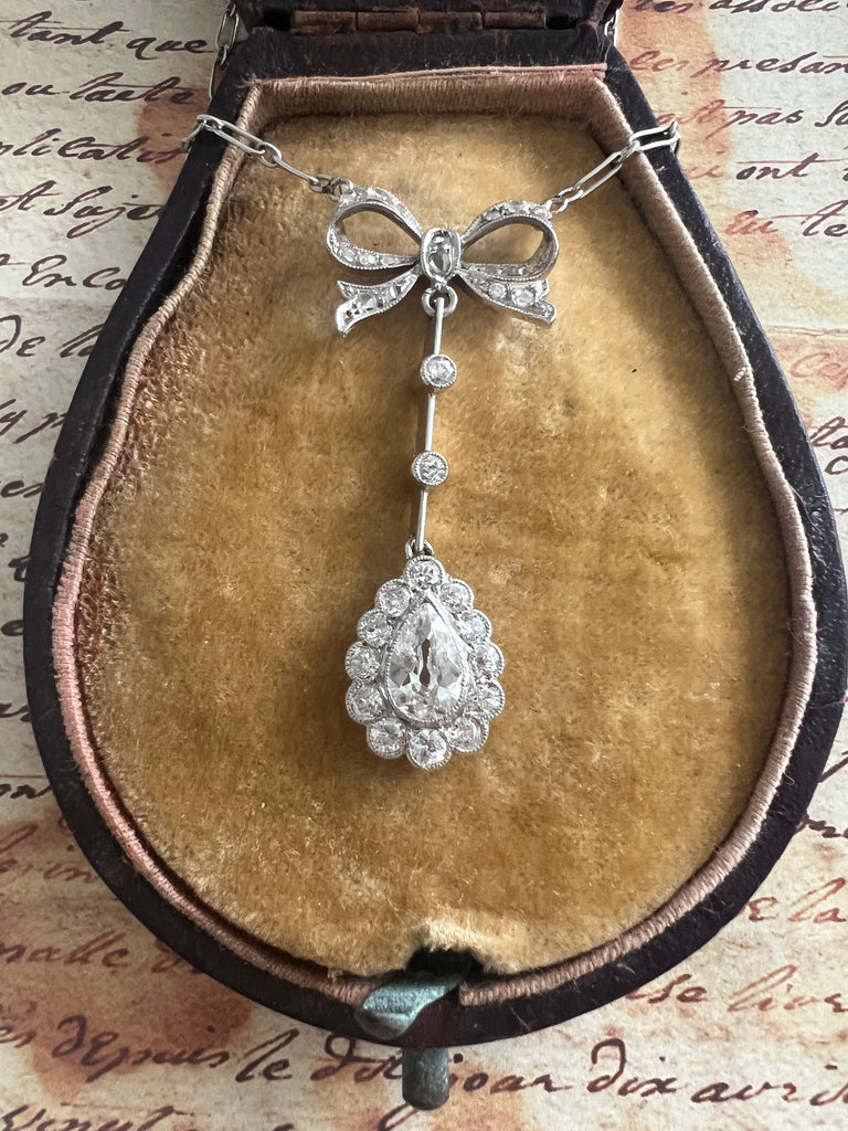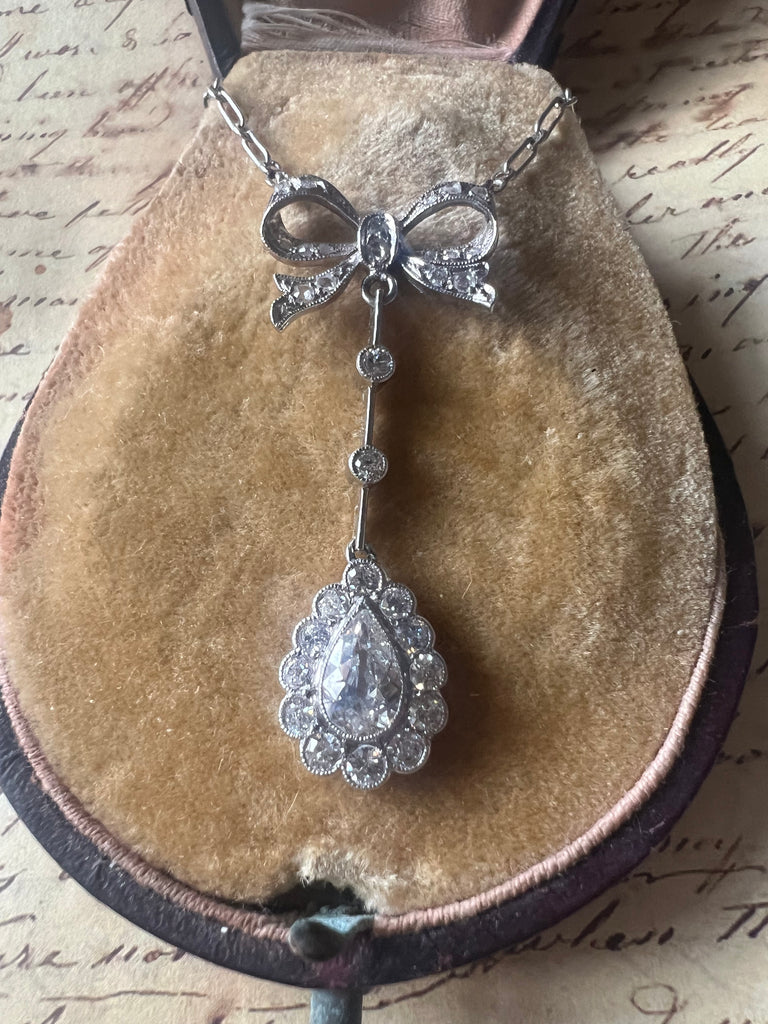 This original French antique lavaliere necklace features a delicately pierced diamond bow suspending a long knife edge drop and a luminous pear shaped old diamond framed by rose cuts. The proportions are elegant and architectural - light on the neck and dramatic in movement.