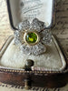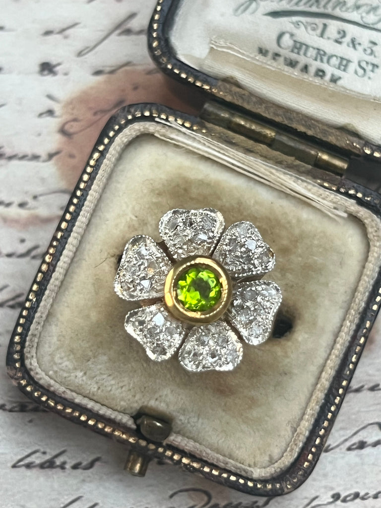 At the center sits a vivid green peridot of 0.43ct, bezel set in 9kt warm yellow gold. Surrounding it is a floral cluster of natural diamonds, set into a silver-toned top that enhances their brightness and contrast.